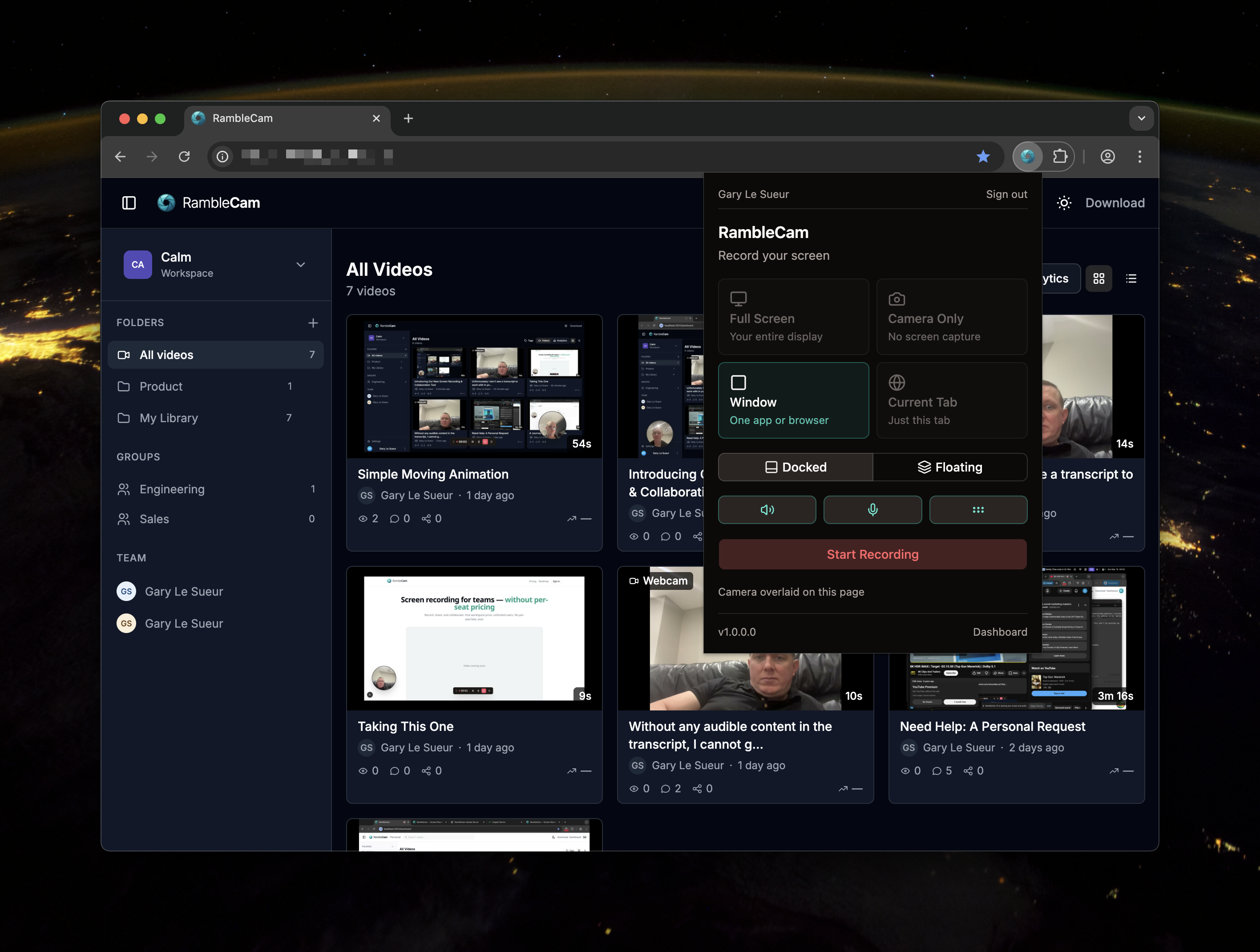 Recordings get buried in Slack threads and email. No shared library, no tags, no way to find what was recorded last Tuesday.